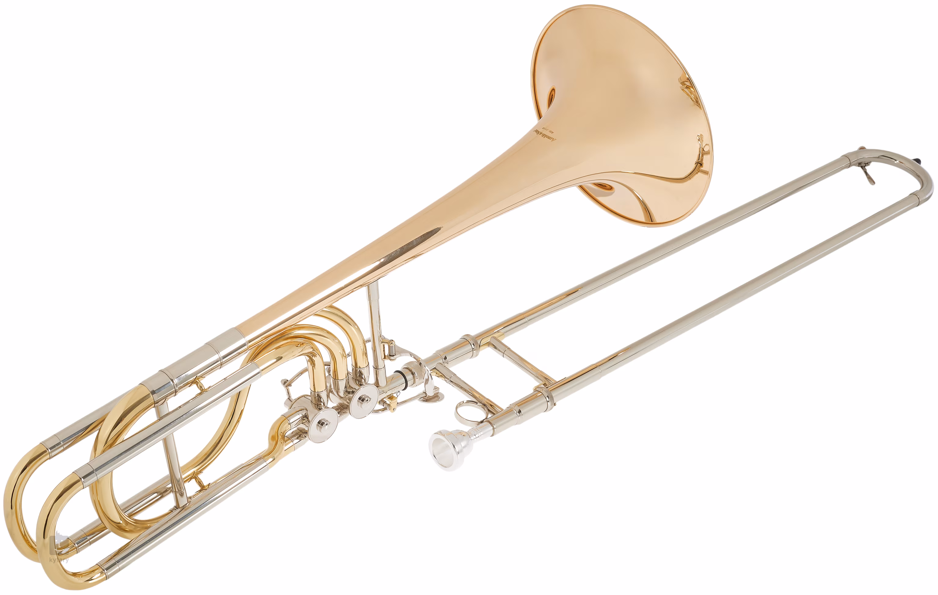 Acest trombon bas din alamă are o claviatură din alamă aurie, cu fundul interior și exterior din nichel argintiu.