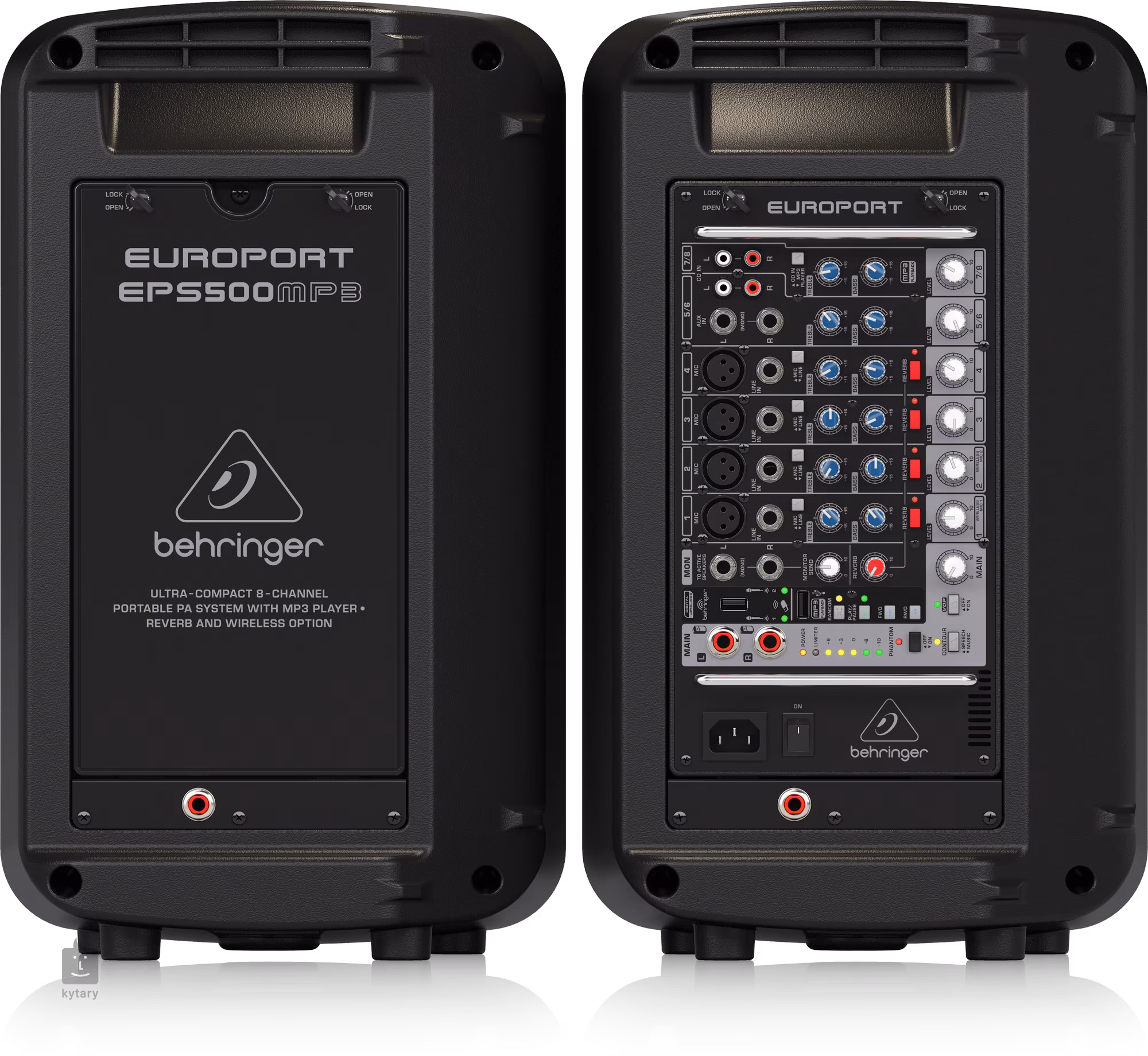 Behringer EPS500MP3 este un sistem PA portabil cu opt canale, cu o putere maximă de ieșire de 500 de wați (250 W + 250 W). Difuzoarele sunt echipate cu un subwoofer de opt inci și un driver de opt inci de înălțime. Oferă redare MP3 de pe USB, patru intrări de microfon/linie cu alimentare fantomă și două canale stereo, un egalizator cu două benzi pe fiecare canal, reverberație digitală încorporată și conectivitate wireless prin ULM. Pachetul include microfonul XM1800S, un cablu de microfon, două cabluri pentru difuzoare, un suport pentru microfon și un adaptor pentru a atașa difuzorul la suporturile standard pentru difuzoare (36 mm).
