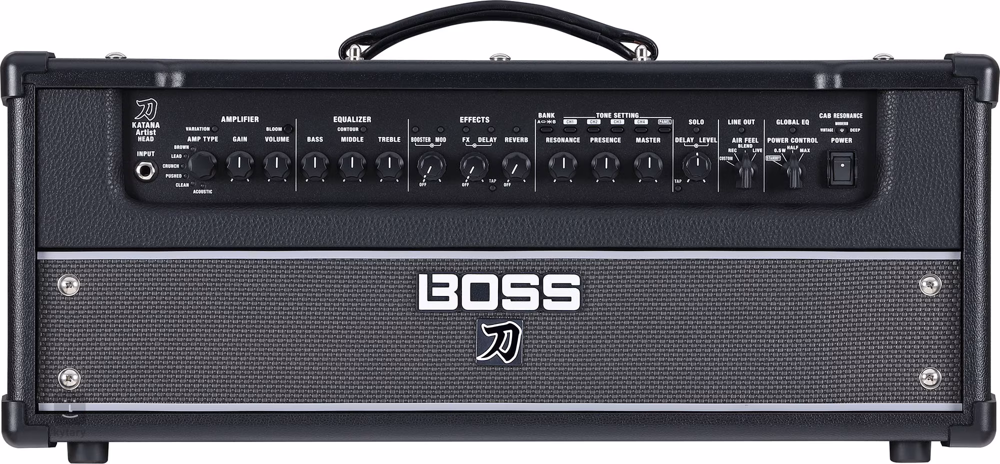 Amp Type, Gain, Volume, Bass, Middle, Treble, Booster/Mod, FX/Delay, Reverb, Resonance, Presence, Master, Delay Level, Air Feel, Power Control (Standby, 0,5 W, Half, Max), Tone Setting (Bank A-B, CH1, CH2, CH3, CH4, Panel), Variation, Bloom, Contour, Cab
