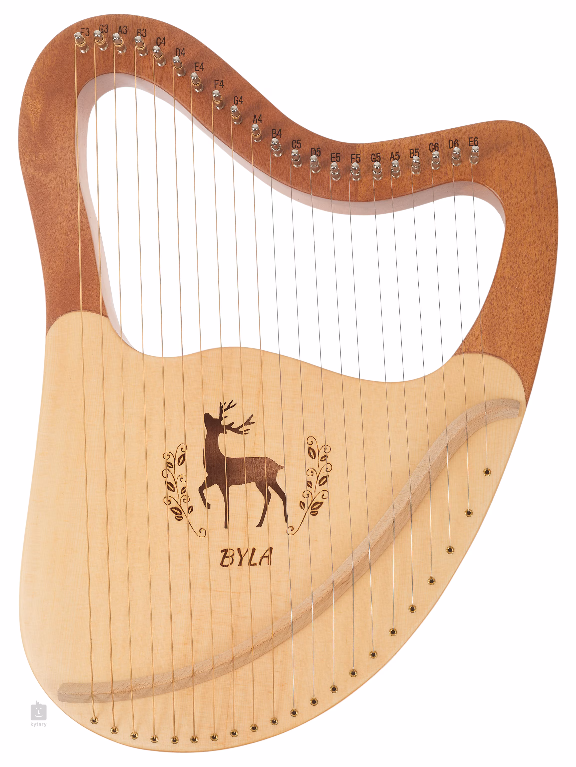 Lyra LH21-W este de culoare naturală, are douăzeci și una de corzi și este decorată cu o sculptură în jurul gurii de sunet în formă de cerb.