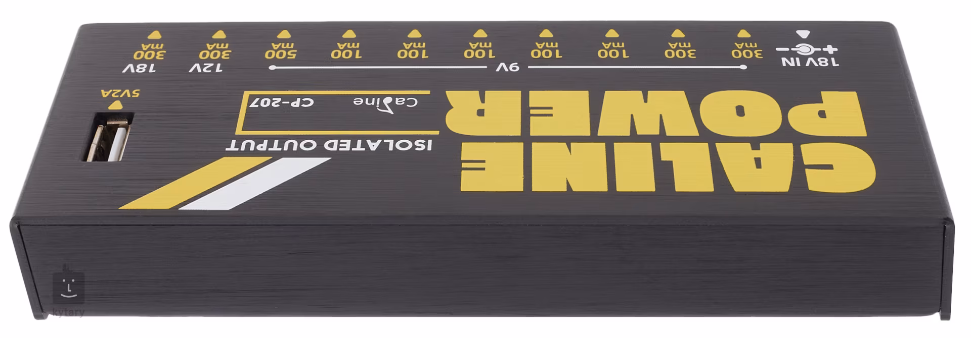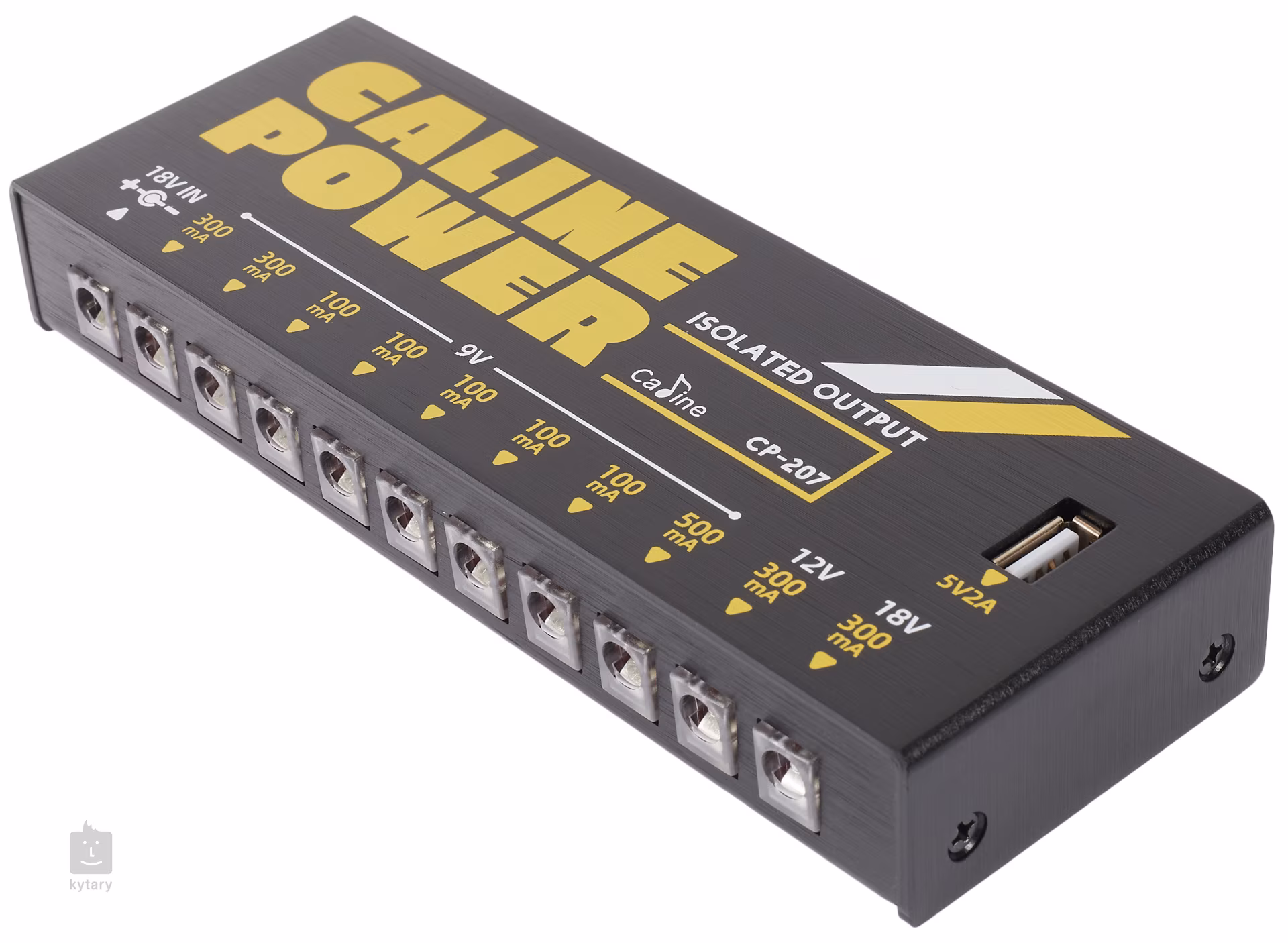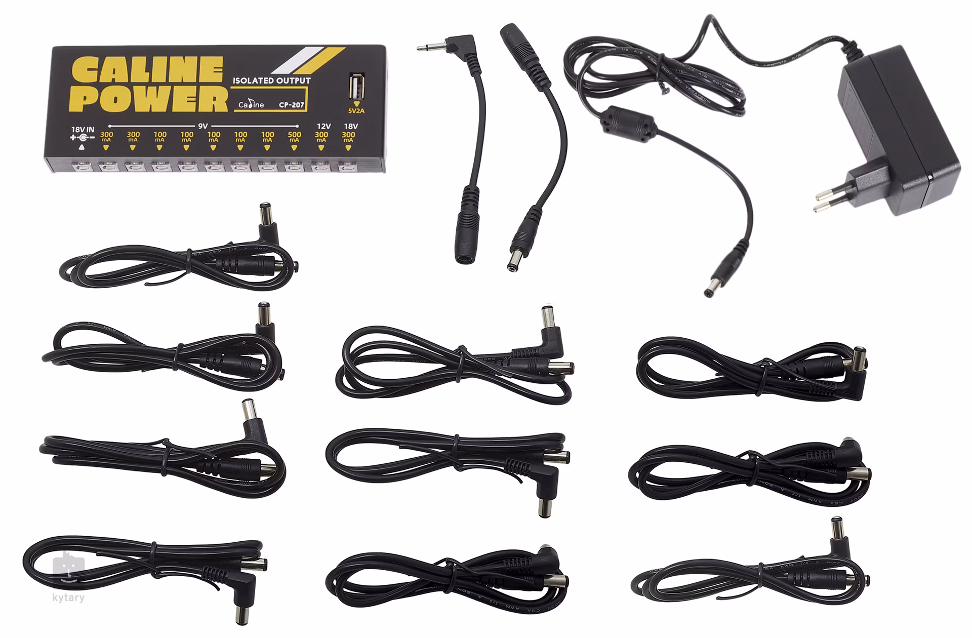 CP-207 este un multi-adaptor Caline de marcă chineză care oferă un total de zece ieșiri pentru alimentarea efectelor de chitară. Opt dintre ele oferă 9 V și o absorbție maximă de 5x 100 mA, 2x 300 mA și 1x 500 mA pentru a alimenta cele mai comune efecte de chitară. Pentru pedalele mai consumatoare de energie, există o ieșire de 12 V (300 mA) și o ieșire de 18 V (300 mA). Toate ieșirile sunt izolate una de cealaltă pentru a asigura o funcționare silențioasă, fără zgomot nedorit. Alte caracteristici importante sunt indicatorul LED la fiecare slot de alimentare și protectorul de supratensiune, care protejează efectele pedalei conectate împotriva deteriorării în cazul unui scurtcircuit.