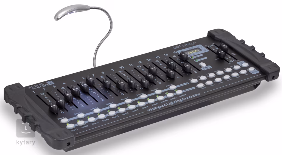 Scenemaker 1232 de la CentoLight este un controler DMX versatil care poate controla până la 12 corpuri de iluminat, fiecare dintre acestea putând avea 32 de canale. În total, acesta poate gestiona 384 de canale DMX. În plus, vă permite să programați până la 240 de scene și să creați secvențe din acestea - le puteți declanșa apoi fie automat, cu muzică, MIDI sau manual. Pe controler, veți găsi 16 stick-uri pentru fiecare canal, plus stick-uri pentru controlul vitezei și fade. Există, de asemenea, butoane pentru comutarea rapidă între scene și un afișaj LED pentru o navigare ușoară între funcții.