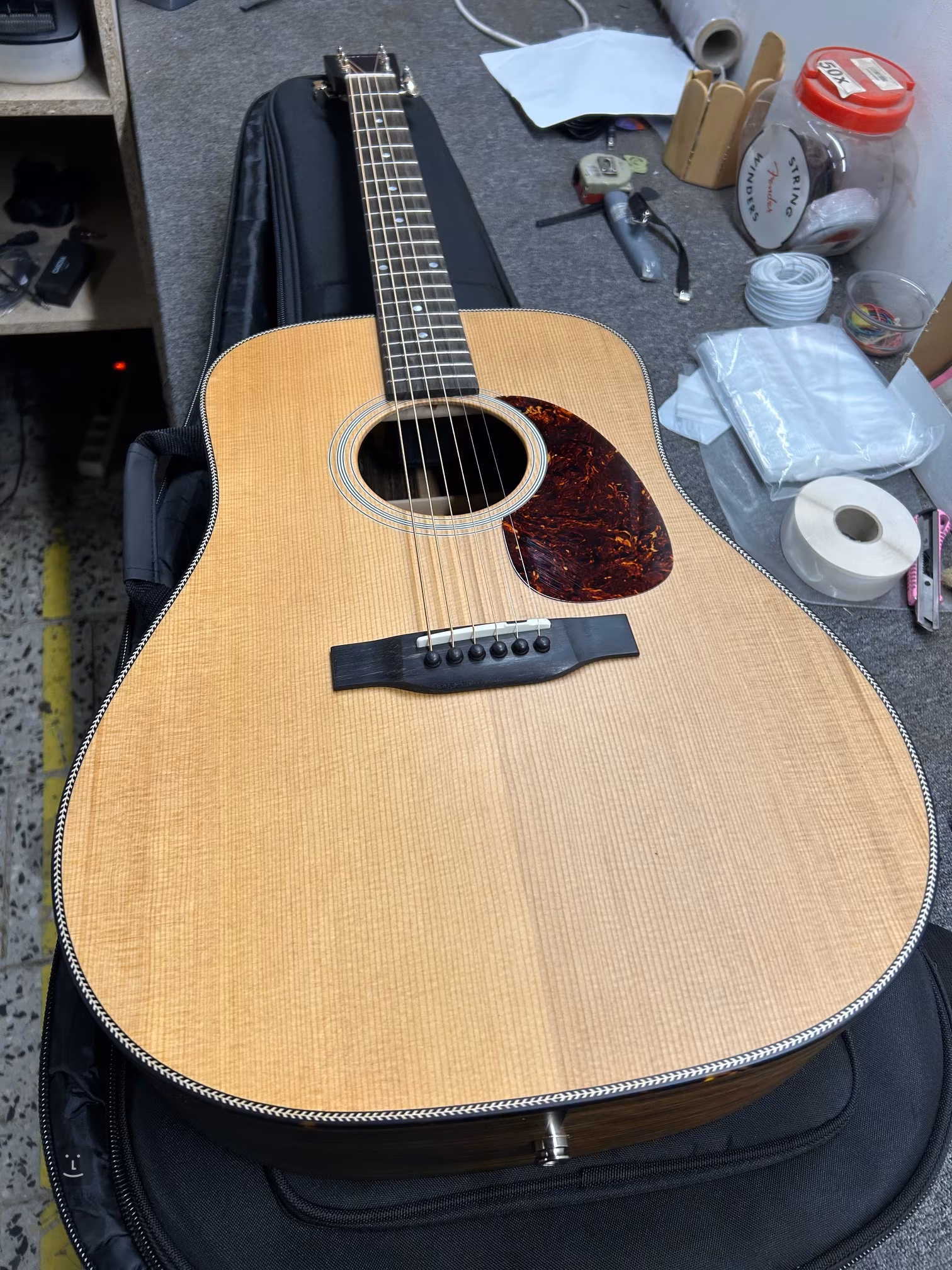 Coardele sunt ținute în acordaje deschise din nichel (Open-Gear PingWell V93N 3+3) și o claviatură din abanos peste un fret din os. Manopera frumoasă este accentuată de legarea pe două fețe a corpului din imitație de carapace de broască țestoasă, completată de un pickguard în formă de herringbone, un pickguard din imitație de carapace de broască țestoasă și logo-ul companiei perlat pe tetieră.