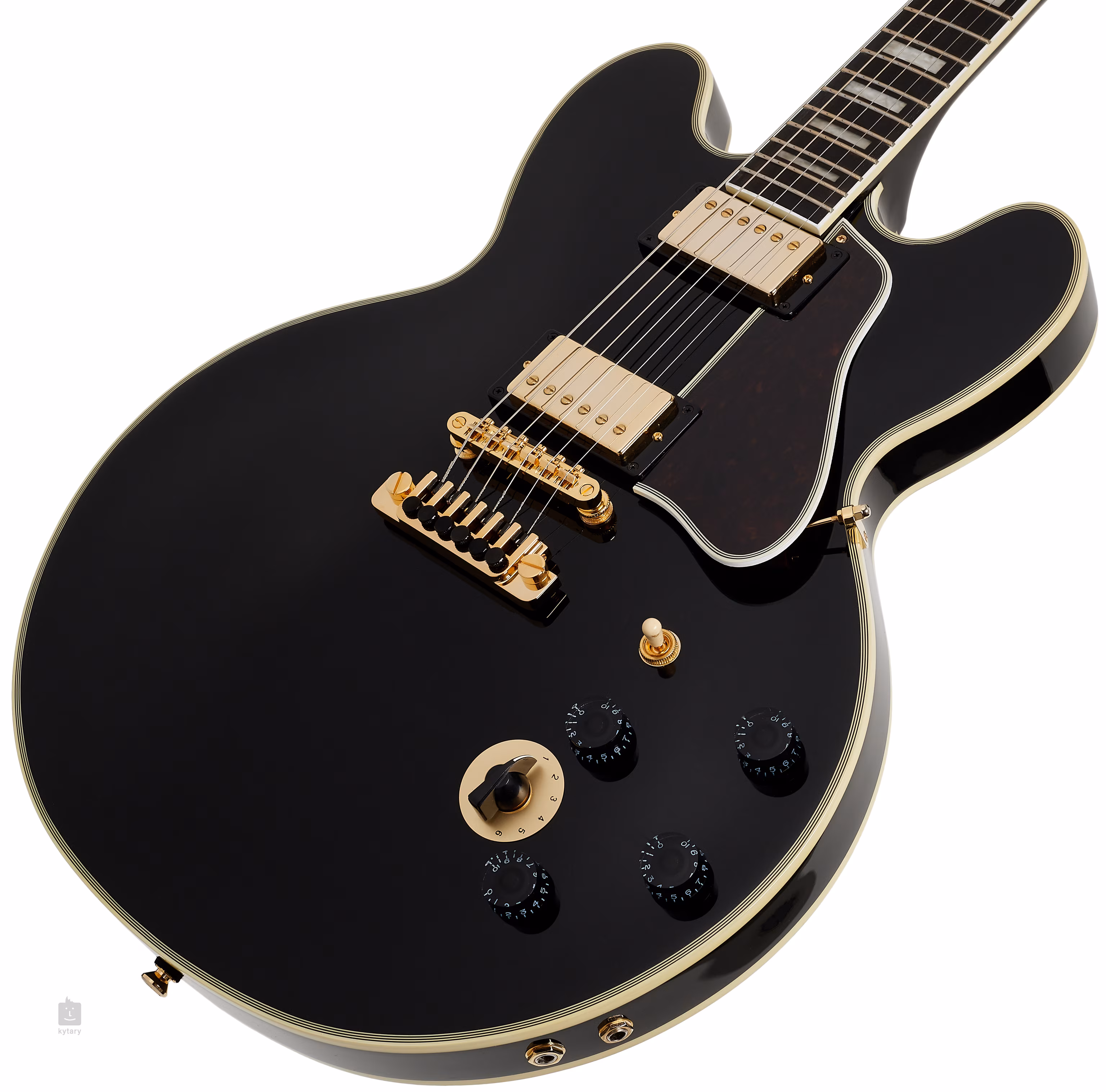 Coardele sunt ținute în mașinile de acordat Grover Rotomatic cu pivoți Keystone prin intermediul unei fante zero Graphtech și a unei cozi LockTone TOM și a unor coarde TP-6. Frumoasa manoperă este accentuată de feroneria aurie, capacul bracingului din alamă decorat cu gravură, legătura multistratificată pentru corp și tetieră și pickguard-ul în cinci straturi din imitație de scoică de broască țestoasă în design ES-335.