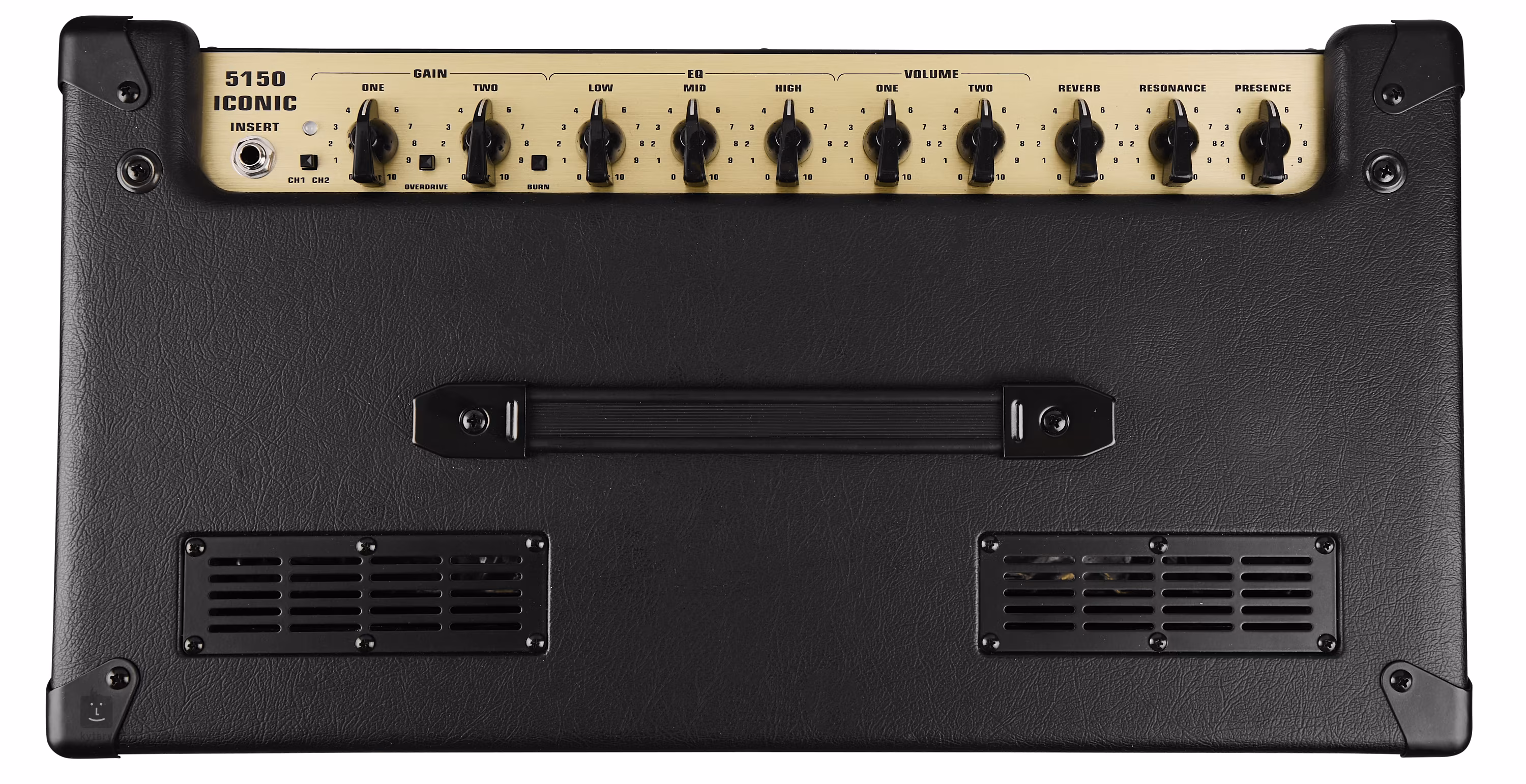 CH1/CH2 switch, Gain One (Overdrive switch), Gain Two (Burn Switch), Low, Mid, High, Volume One, Volume Two, Reverb, Resonance, Presence
