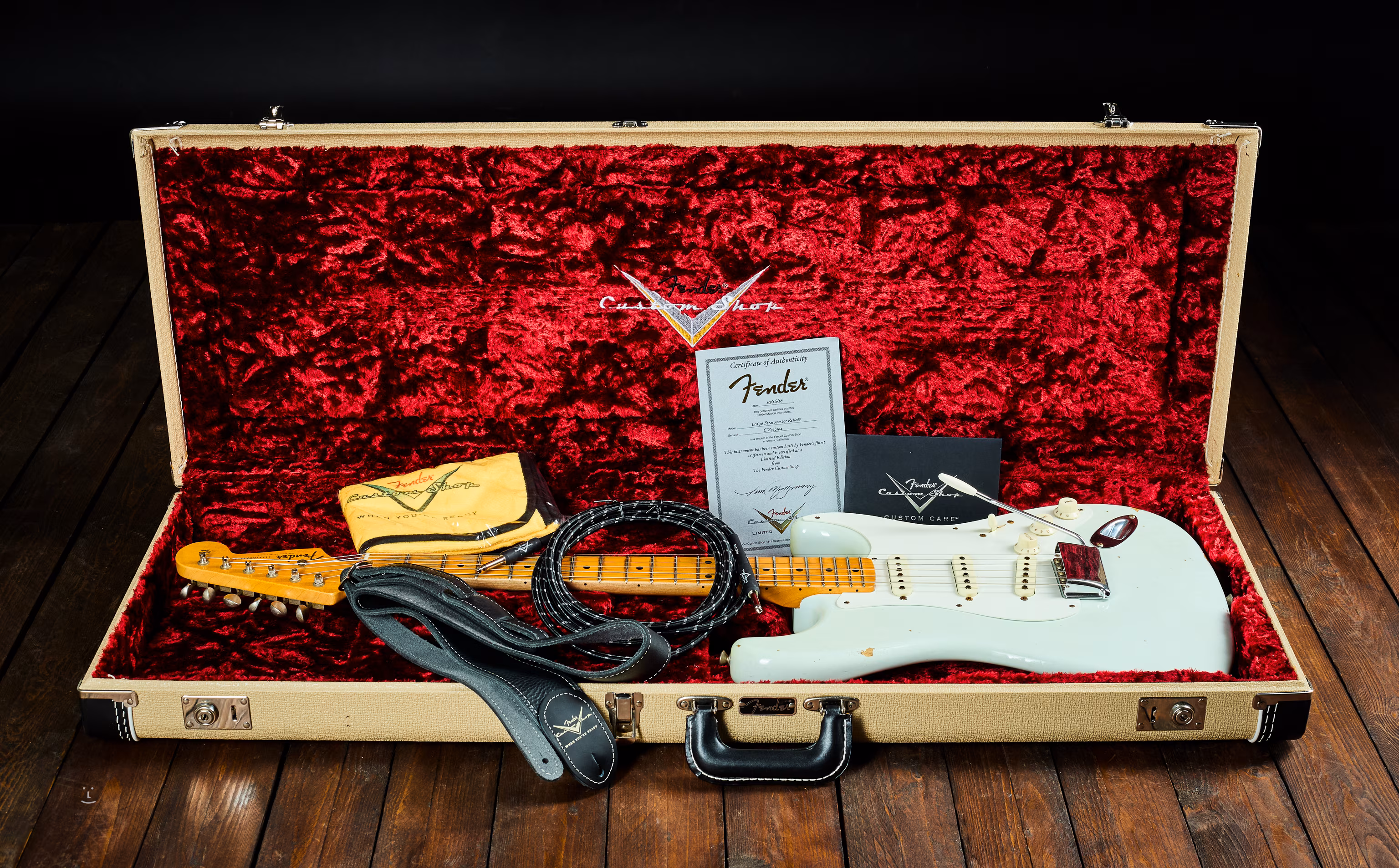 Acesta este un articol folosit în sensul de TVA - la mâna a doua. Instrumentul în sine este în stare foarte bună, cu doar câteva semne minore de utilizare anterioară. Vânzarea include carcasa originală Fender Custom Shop, certificatul COA, cablu, curea din piele și pânză de lux.