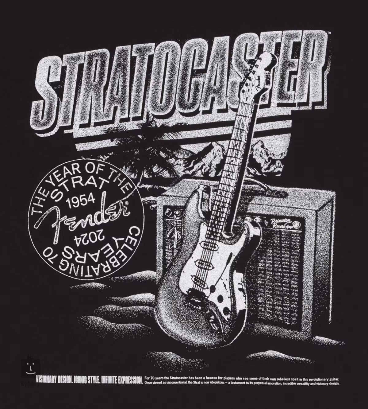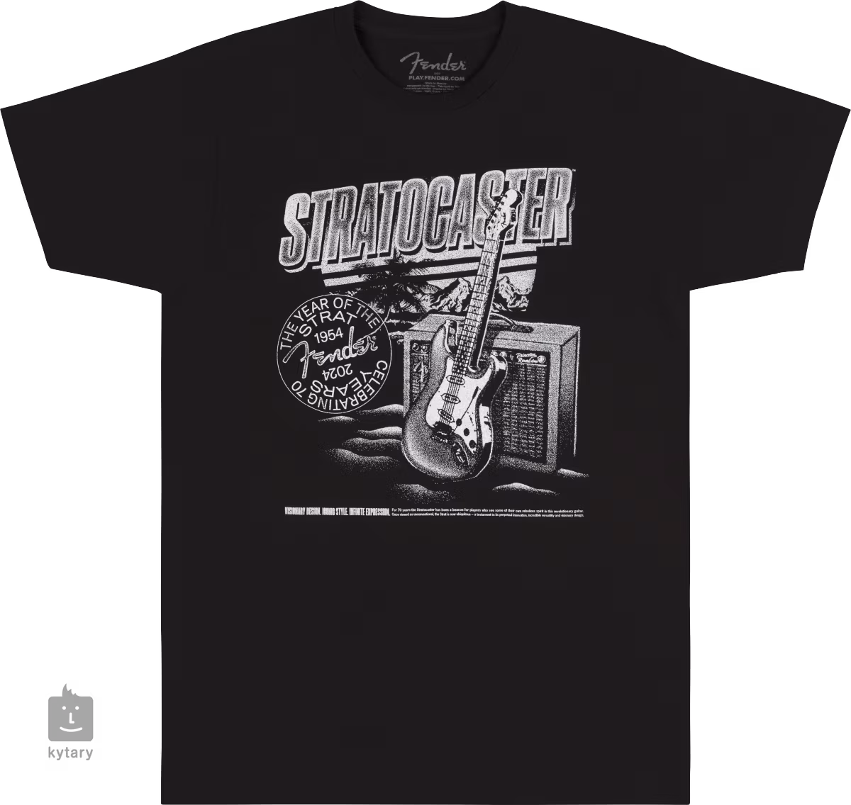 Tricou negru din bumbac Strat 70th Anniversary Tee Black comemorează cea de-a 70-a aniversare a chitarei electrice Fender Stratocaster. Tee-ul este disponibil în diferite mărimi.
