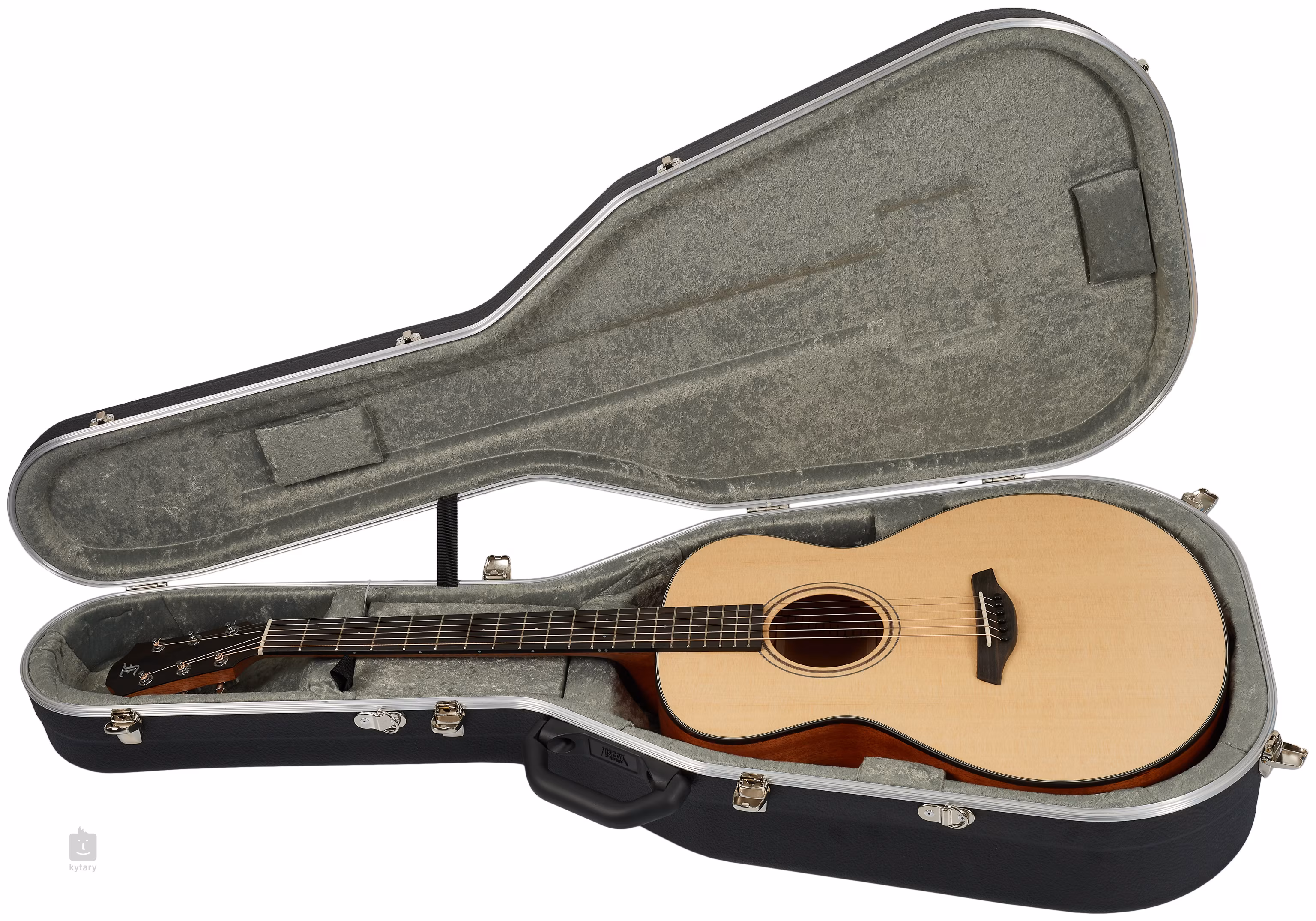 Orientarea pe diapazonul de abanos este facilitată de marcajele frontale și laterale cu puncte perlate. Pickguard-ul transparent lasă să iasă în evidență granulația naturală a lemnului, fără a afecta rezonanța plăcii de sunet. Acordarea precisă și stabilă este garantată de mecanica cromată a companiei, cu un raport de transmisie de 1:18. Lucrarea frumoasă este accentuată de legarea imitației de carapace de broască țestoasă cu cinci straturi de linii contrastante alb-negru și o rozetă constând dintr-un inel dublu cu incrustații din nuc.