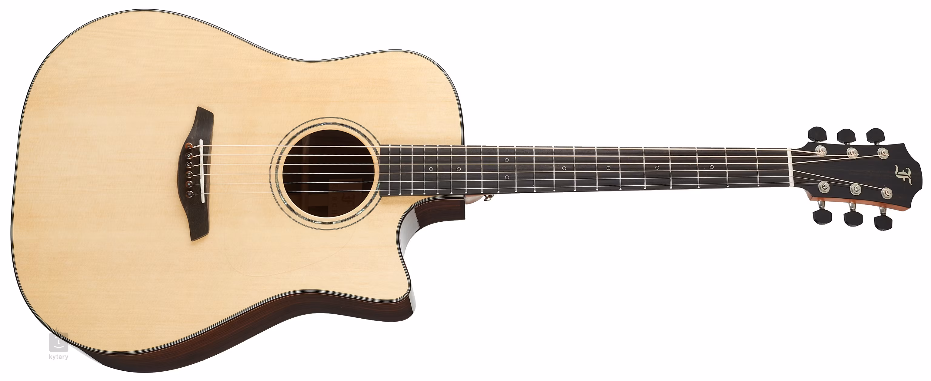 Orientarea pe diapazonul de abanos este facilitată de marcajele de poziție circulare frontale elegante, cu o linie de contur subțire din nucă de nucă albă și marcaje laterale cu puncte din nucă de nucă. Pickguard-ul transparent lasă să iasă în evidență granulația naturală a lemnului, fără a afecta rezonanța plăcii de sunet. Acordarea stabilă este garantată de mișcarea Gotoh 510 de calitate superioară, în patină argintie, cu clapete de abanos lustruite și un raport de transmisie extrem de rafinat de 1:21. Prelucrarea fină este accentuată de detaliile fine sub formă de legare a corpului în carapace de broască țestoasă falsă și rozetă cu inel dublu cu incrustații de abalone verde cu linie albă și neagră.