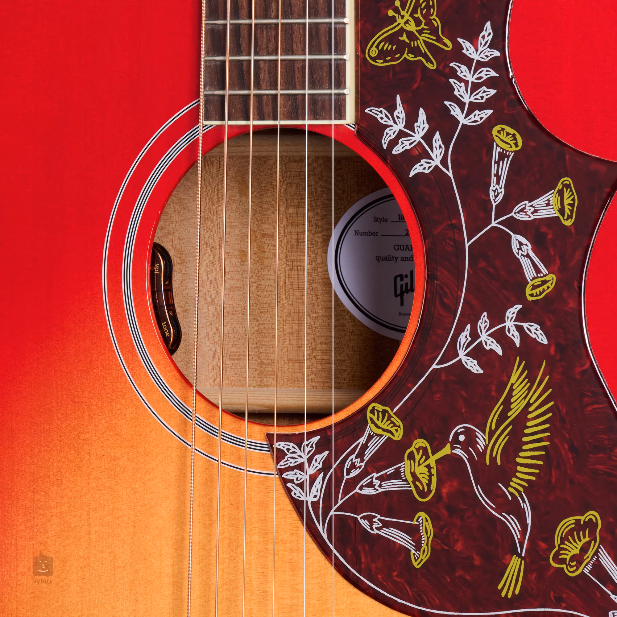 Partea frontală a chitarei Hummingbird Standard Vintage Cherry Sunburst este fabricată din molid Sitka masiv, în timp ce spatele și părțile laterale sunt fabricate din mahon masiv. Gâtul din mahon cu un profil plăcut rotunjit este lipit de o claviatură din lemn de trandafir indian prevăzută cu douăzeci de fante de dimensiuni Standard. Orientarea pe claviatură este facilitată de indicatoarele de poziție din nucă de perle (Mother-of-Pearl Parallelograms).