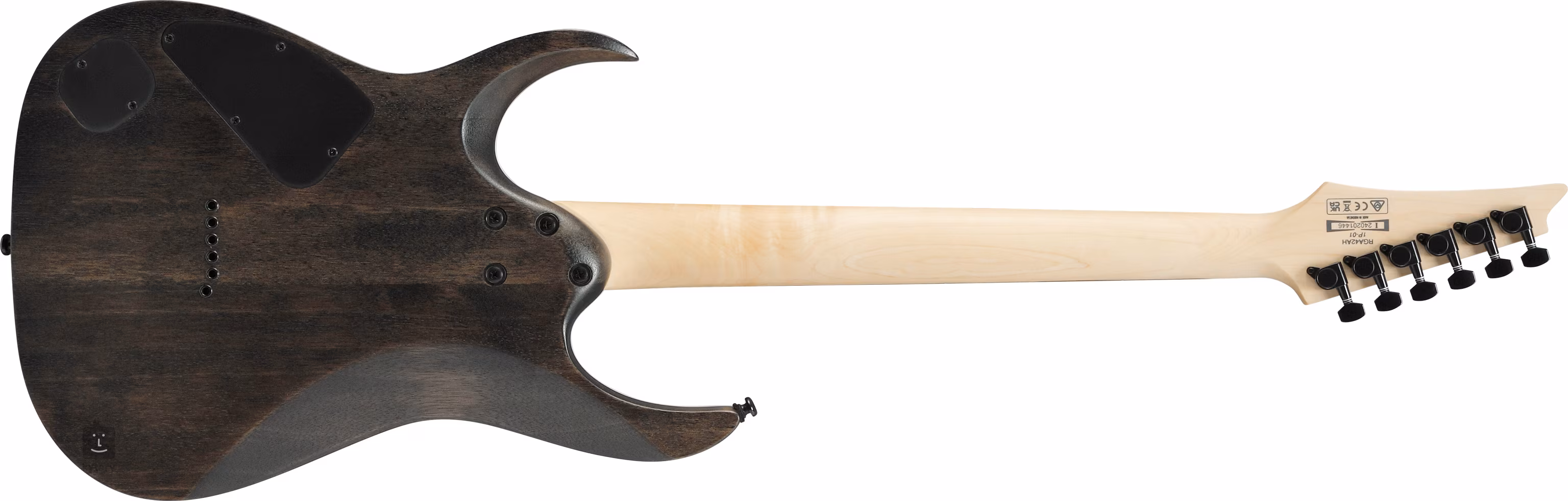Corpul chitarei RGA42AH Black Stained este fabricat din lemn de meranti și are un top din frasin. Gâtul rapid din arțar cu profil Wizard III este lipit de o claviatură din jatoba prevăzută cu douăzeci și patru de frete jumbo. Orientarea pe fingerboard este facilitată de punctele de poziție decalate.