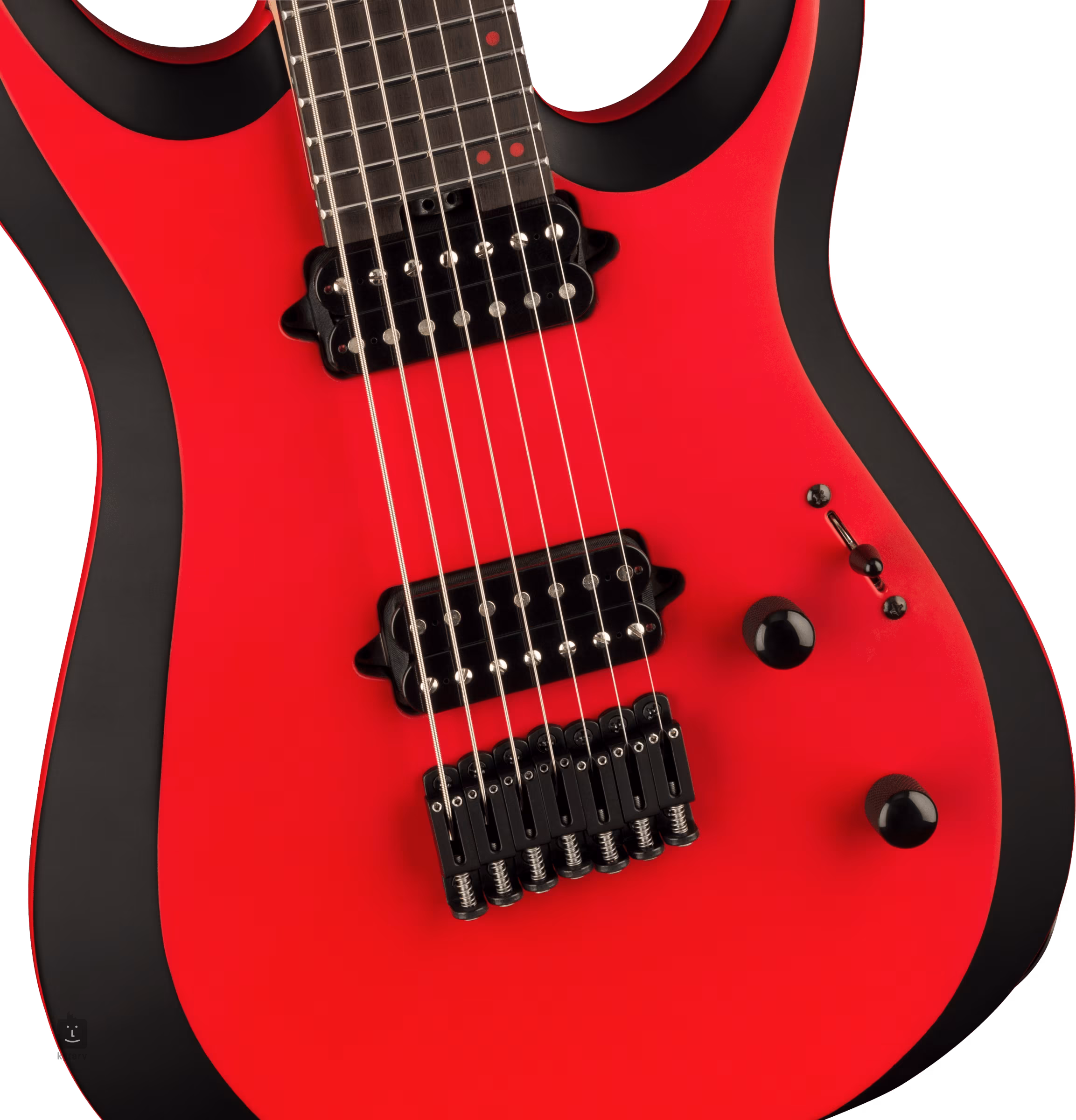 Corpul chitarei electrice cu șapte corzi Pro Plus Series DK Modern MDK7 HT Satin Red with Black bevels este fabricat din lemn de tei. O claviatură de abanos dotată cu douăzeci și patru de fise jumbo din oțel inoxidabil este lipită de un gât din trei piese de arțar și nuc, cu șuruburi, întărit cu brațe de grafit. Orientarea pe suprafața claviaturii este facilitată de indicatoarele de poziție decalate, realizate din imitație de mătase și de punctele luminescente de pe laterale, ceea ce vă oferă o vizibilitate perfectă chiar și în cele mai întunecate locuri de pe scenă.