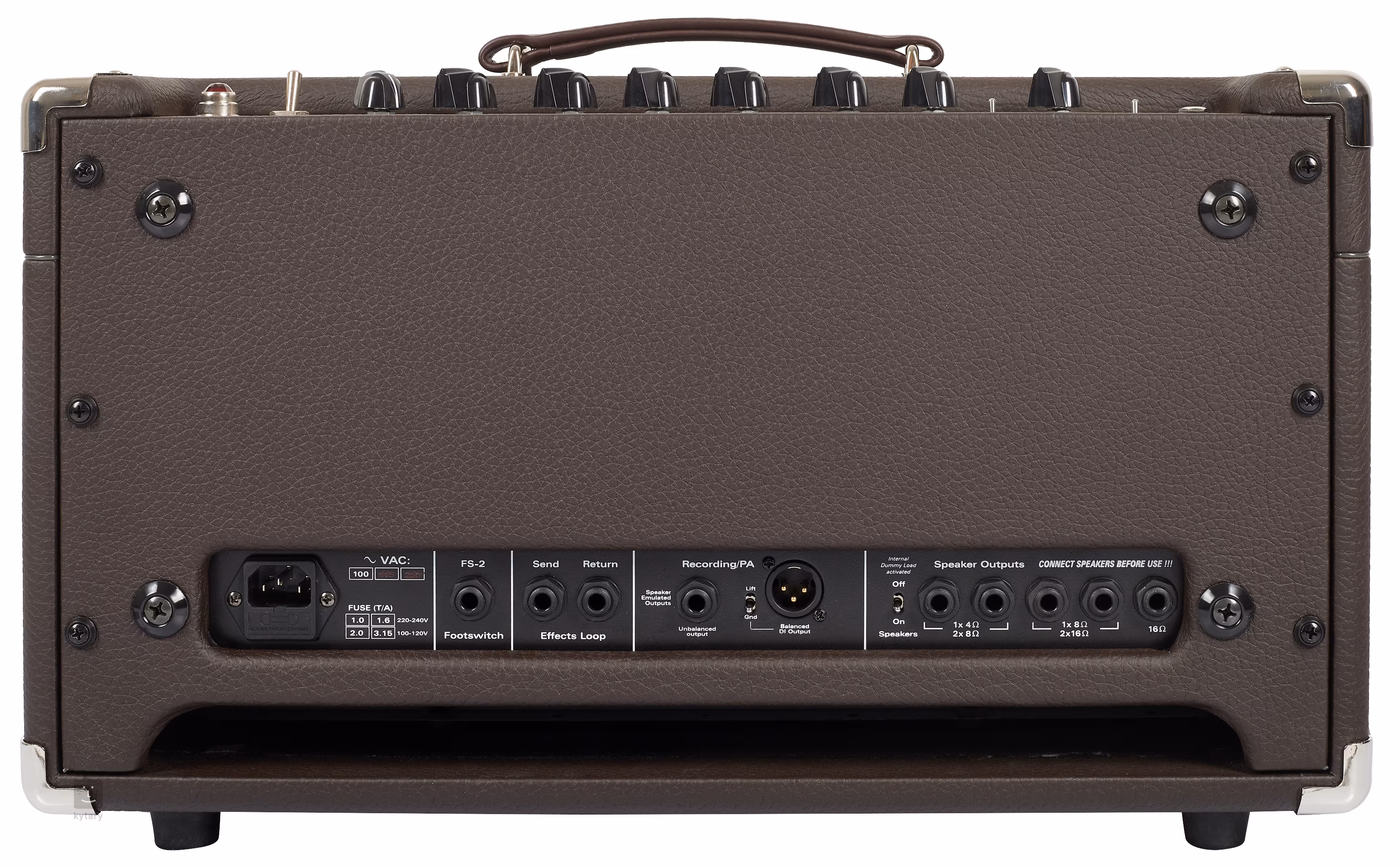 Panoul din spate oferă o buclă de efecte seriale pentru integrarea efectelor tale preferate cu pedale, ieșiri către difuzoare externe (1x4/2x8, 1x8/2x16, 1x16 ohmi), o ieșire XLR echilibrată și o ieșire jack de 6,3 mm neechilibrată cu masă comutabilă pentru conectarea directă a combo-ului la echipamentul de înregistrare sau la PA și o intrare pentru comutatorul de picior inclus pentru a comuta între canale.
