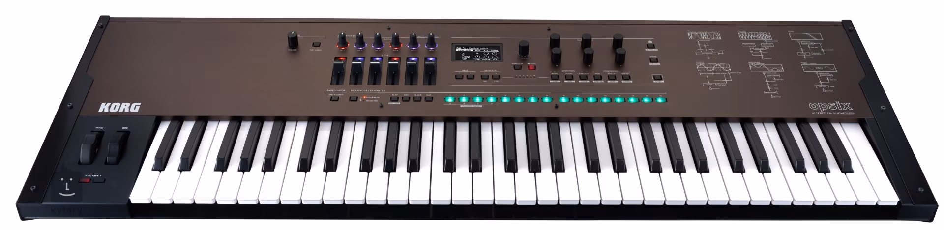 Secțiunea Operator Mixer simplifică sinteza FM și o face nu numai inteligibilă, ci și controlabilă - un set simplu de șase faders și potențiometre vă încurajează să găsiți sunetul potrivit. Fiecare secțiune se luminează în roșu pentru a indica frecvențele purtătoare sau în albastru pentru modulatori. Manipularea faderelor deschide noi posibilități de modelare a sunetului, dând o nouă viață ideilor dumneavoastră. Acest flux de lucru direct și practic este o parte din ceea ce face ca opsix SE să fie atât de unic, la fel ca și sunetele pe care le oferă. Prin adăugarea mai multor opțiuni de sinteză și programare, acesta oferă un flux de lucru mai eficient și un sunet și mai bogat. Opsix SE dispune de o tastatură premium de 61 de taste cu răspuns natural, cu funcționalitate aftertouch. Tastatura oferă capacitatea de redare superioară pe care o așteptați de la stațiile de lucru emblematice ale Korg. Cu o carcasă metalică elegantă și robustă, opsix SE este făcută atât pentru performanțe live intense, cât și pentru lucrul precis în studio. Manetele metalice sunt optim echilibrate pentru o configurare ușoară. Sub exteriorul său, opsix SE se mândrește cu o incredibilă polifonie stereo de 80 de voci.