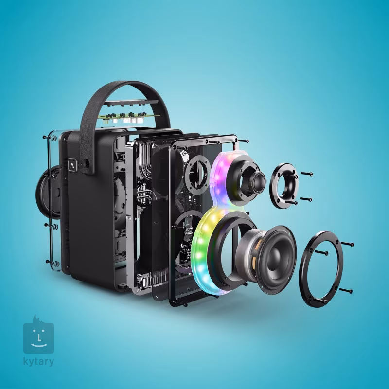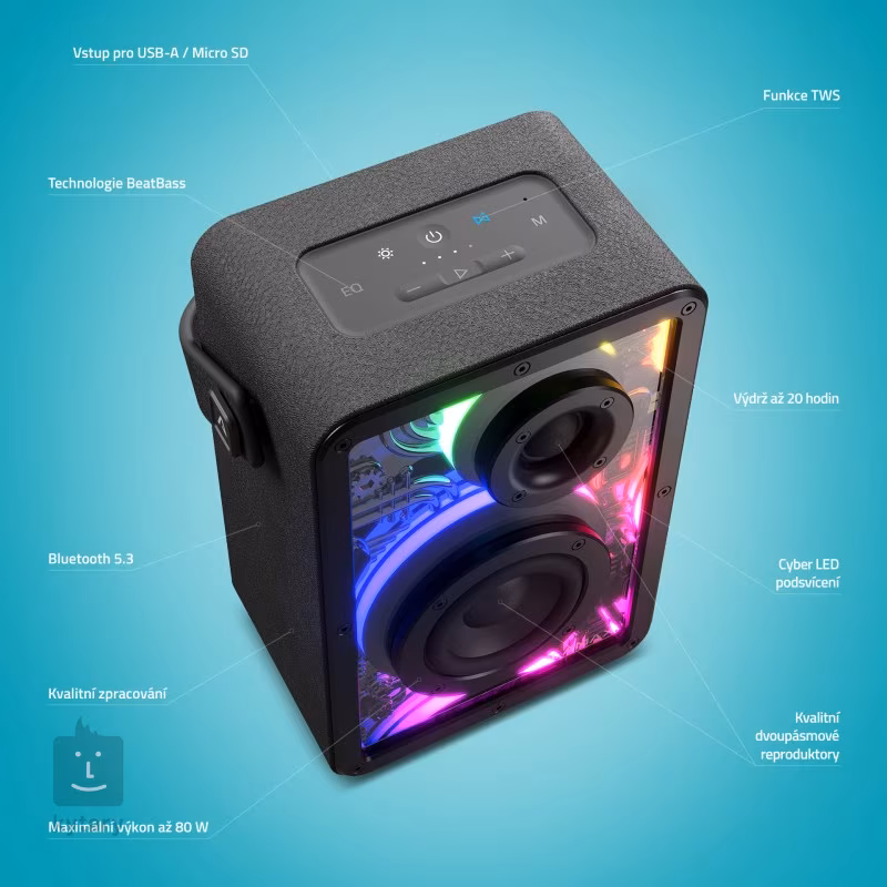 te vei bucura de bas puternic prin tehnologia BeatBass, în timp ce bateria puternică îți oferă până la 20 de ore de muzică continuă. Datorită rezistenței la apă IPX5, nici nu trebuie să vă faceți griji cu privire la ploaie sau stropii de apă, astfel încât o experiență grozavă pe marginea piscinei este garantată. Iluminarea LED elegantă cu schimbare de culoare adaugă efecte vizuale la orice eveniment, iar Bluetooth 5.3 modern asigură o conexiune stabilă și un control ușor la îndemâna ta. Desigur, suportă și împerecherea a două difuzoare (TWS) pentru o ascultare stereo clasică.