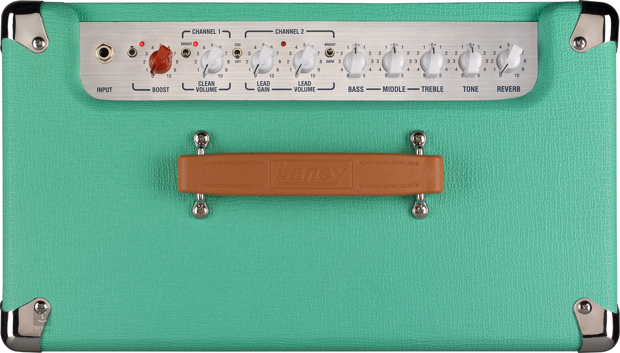Boost, Clean Volume, Lead Gain, Lead Volume, Bass, Middle, Treble, Tone, Reverb, Switches: Boost, Bright, CH1/2, Bright/Natural/Dark