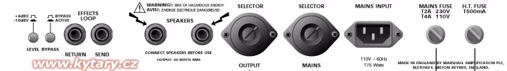 Panoul frontal este proiectat în stilul motto-ului "simplitatea este putere". Veți găsi cele patru intrări tradiționale - intrările din dreapta aparțin primului canal, cele din stânga celui de-al doilea canal, rândul de sus sunt așa-numitele intrări High, cele de jos Low, fiecare canal are desigur o caracteristică de sunet ușor diferită. Singurele controale separate ale canalului sunt Loudness 1 și Loudness 2, care, deoarece aceasta este o mașină de volum non-master, determină volumul, împreună cu care crește distorsiunea sunetului. Aici intră în joc cu adevărat dinamica interpretării dumneavoastră. Pe panoul frontal, există doar controalele Bass, Mid și Treble, ca un EQ standard cu 3 benzi, și potențiometrul Presence, care ajustează comportamentul mediilor superioare la nivelul amplificatorului final.