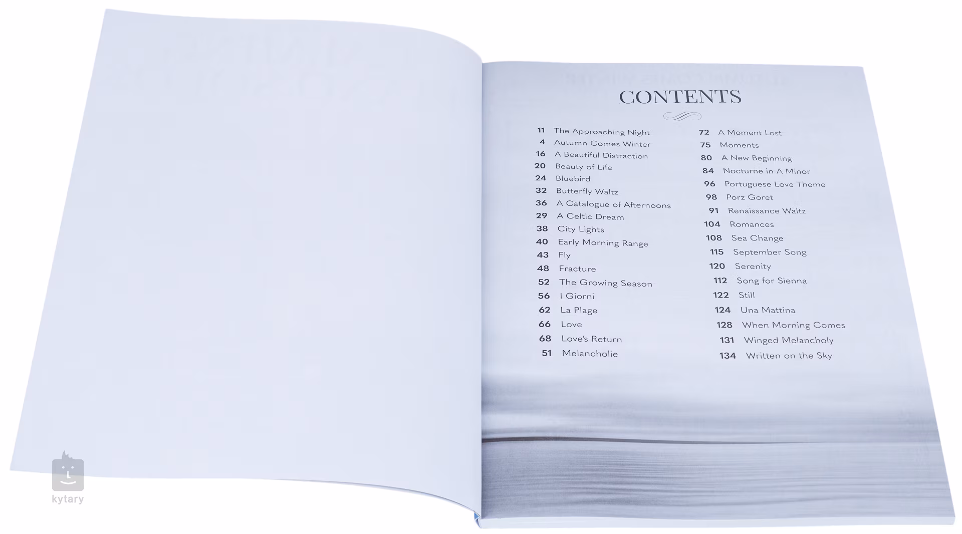 Lista de compoziții: Noaptea care se apropie Toamna vine iarna A Beautiful Distraction (O frumoasă distragere a atenției) Beauty Of Life (Frumusețea vieții) Bluebird Valsul fluturelui Un catalog de după-amiezi Un vis celtic Lumini de oraș Early Morning Range Fly Fractura Sezonul de creștere I Giorni La Plage Dragoste Love's Return Melancholie O clipă pierdută Moments Un nou început Nocturne în la minor Tema de dragoste portugheză Porz Goret Vals renascentist Romances Schimbare de mare Cântec de septembrie Serenitate Cântec pentru Sienna Still Una Mattina Când vine dimineața Melancolie înaripată Scris pe cer