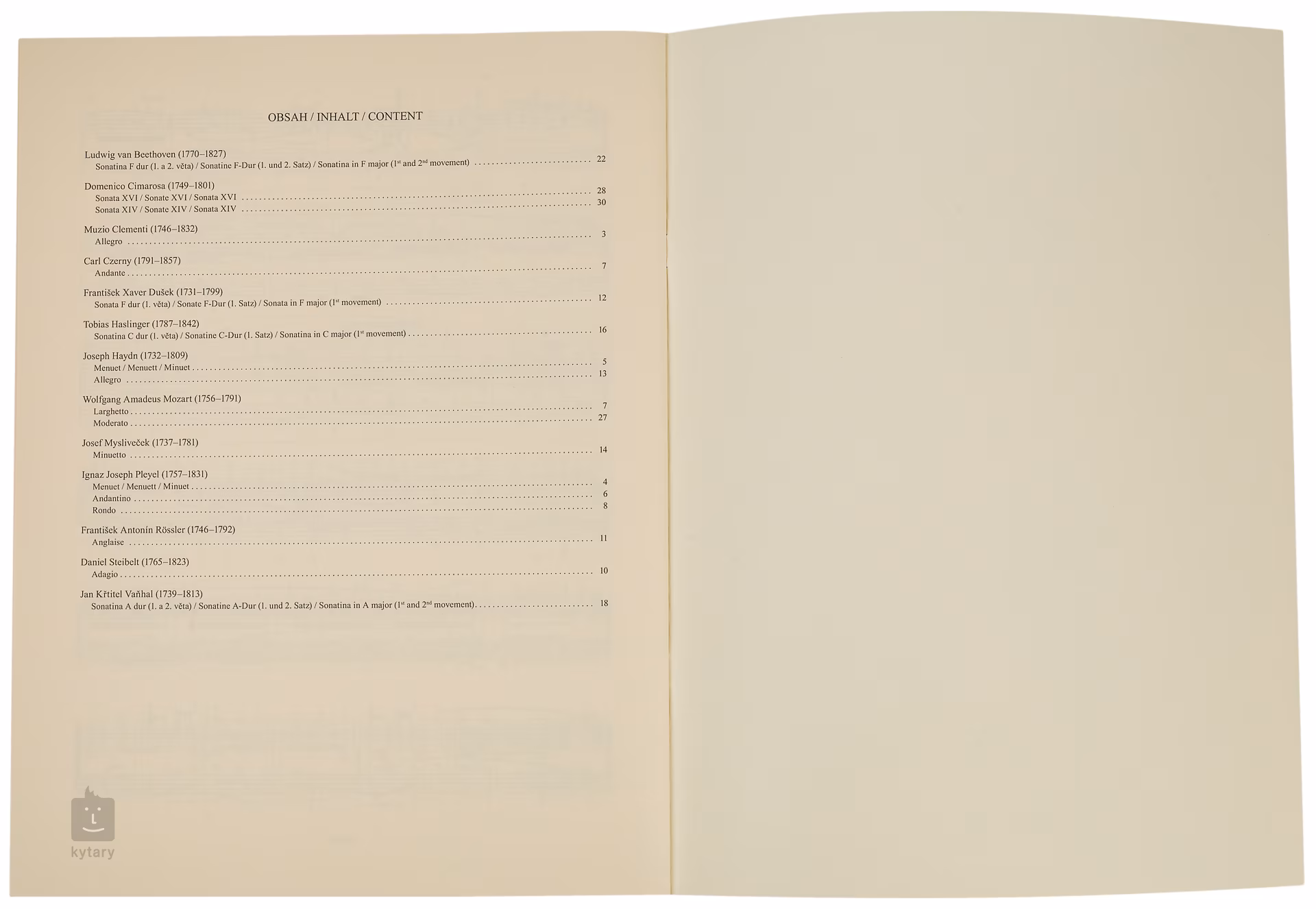 Clementi Muzio: Allegro Pleyel Ignaz Joseph: Menuet Haydn Joseph: Menuet Pleyel Ignaz Joseph: Andantino Czerny Carl: Andante Mozart Wolfgang Amadeus: Larghetto Pleyel Ignaz Joseph: Rondo Steibelt Daniel: Adagio Rössler František Antonín: Anglaise Dušek František Xaver: Sonata în Fa major Haydn Joseph: Allegro Mysliveček Josef: Minuetto Haslinger Tobias: Sonatina în Do major Vaňhal Jan Křtitel: Sonatina în La major Beethoven Ludvig van Beethoven: Sonatina în Fa major Mozart Wolgang Amadeus: Moderato Cimarosa Domenico: Sonata XVI Cimarosa Domenico: Sonata XIV