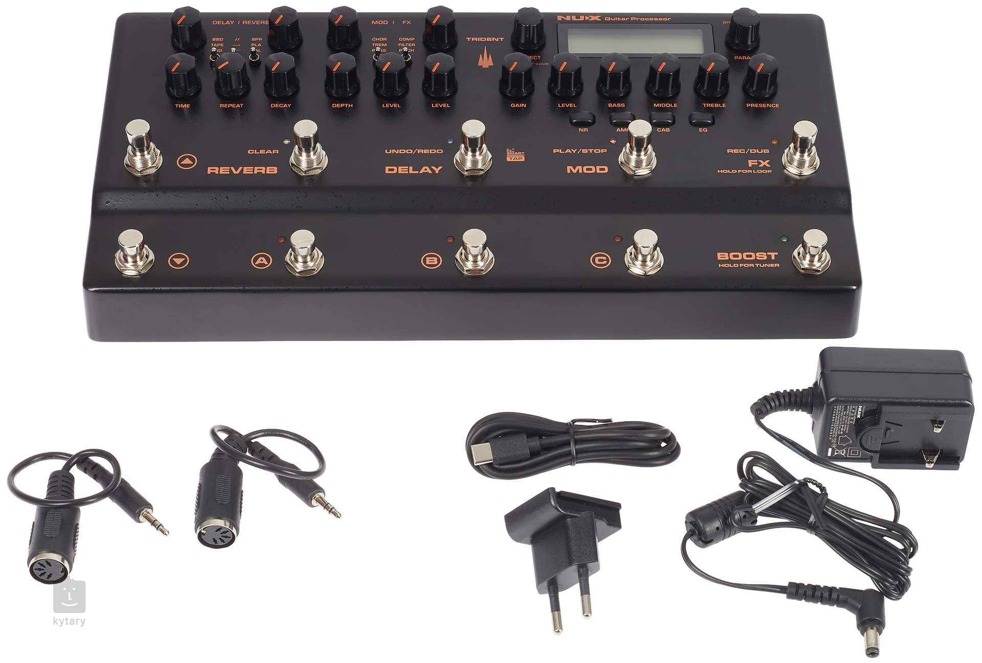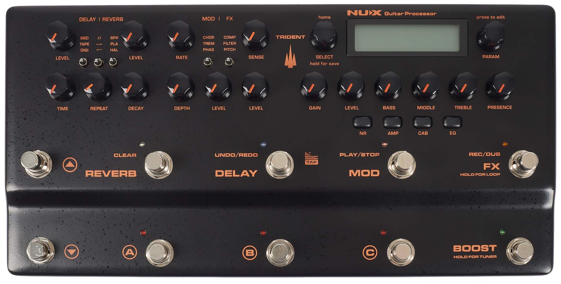Procesorul de efecte de modelare NUX Trident NME-5 se bazează pe multiefectul de chitară Cerberus și îl îmbogățește cu modelarea digitală a amplificatoarelor și efectelor de chitară din seria MG. Cu două cipuri DSP și o tehnologie avansată de modelare, TSAC-4K oferă 27 de simulări de chitară ale unor mărci cunoscute, același număr de difuzoare IR (cu o rezoluție de 1024 de eșantioane) pe care le puteți atribui amplificatoarelor, 32 de sloturi IR personalizate, 4 simulări de captare a microfonului și un total de 96 de presetări.