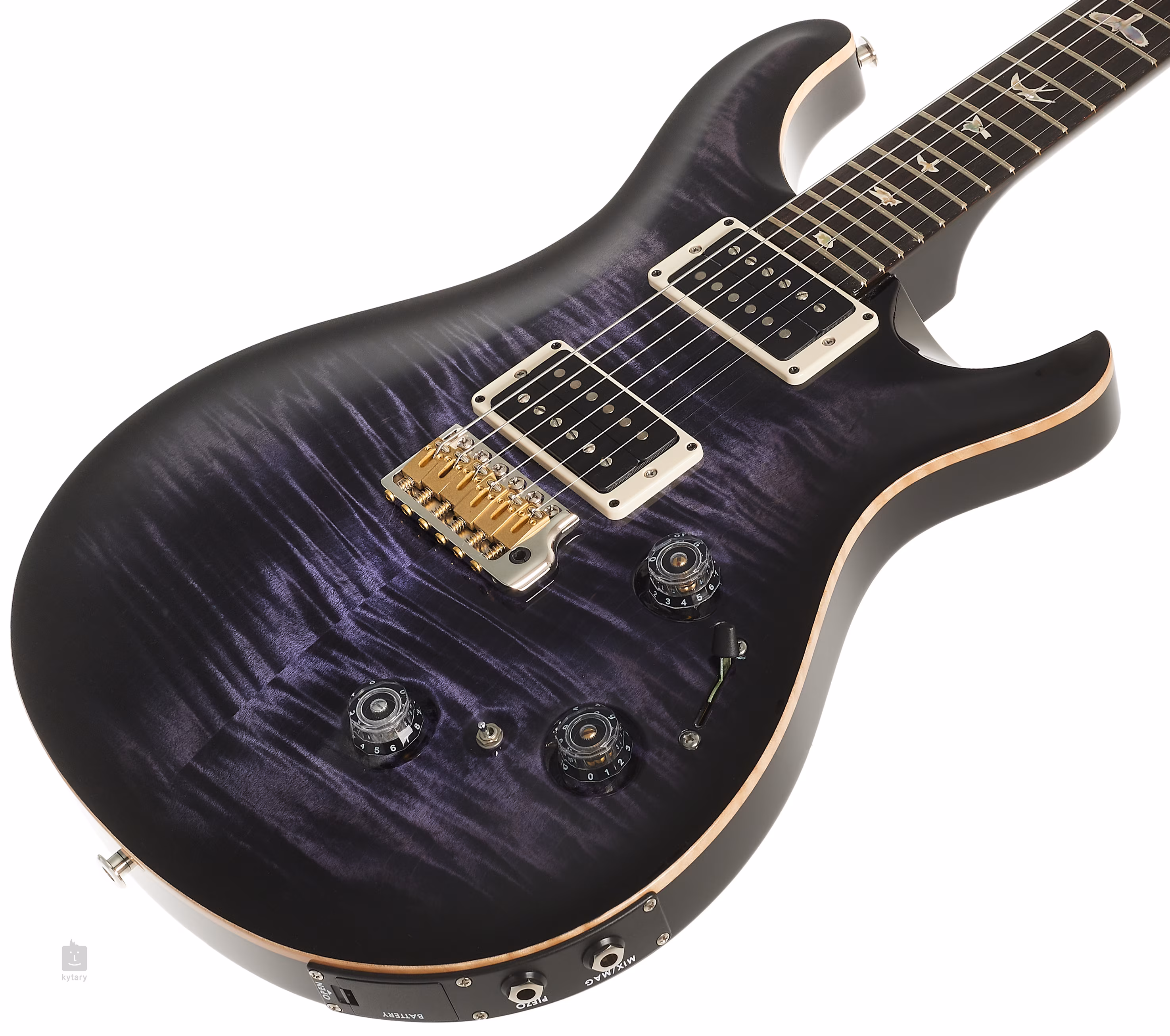Modelul Custom 24 Piezo Purple Mist atrage atenția la prima vedere prin combinația de corp din mahon cu formă ergonomică, cu cutaway dublu tipic PRS și top din arțar figurat cu o granulație răcoroasă a lemnului. Un gât din mahon dintr-o singură bucată cu profil Pattern Thin este lipit de o claviatură din lemn de trandafir prevăzută cu douăzeci și patru de fante. Orientarea pe claviatură este facilitată de marcajele de poziție marca PRS sub forma unor siluete de păsări din nucă de perle.