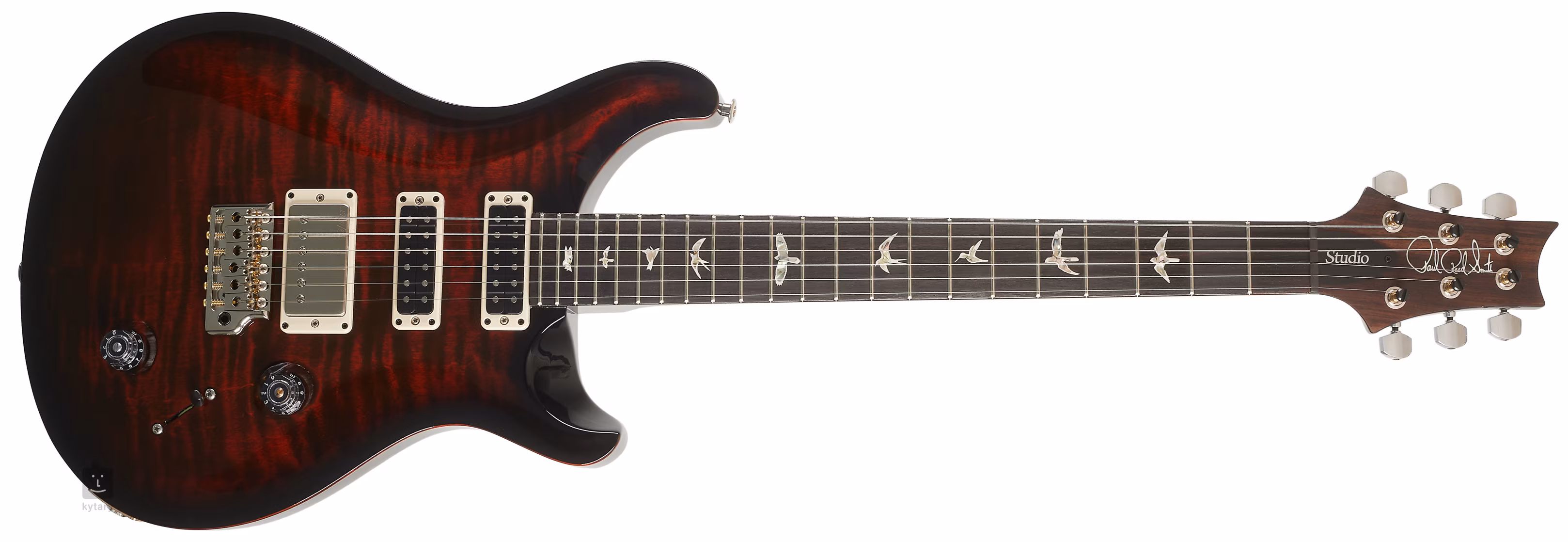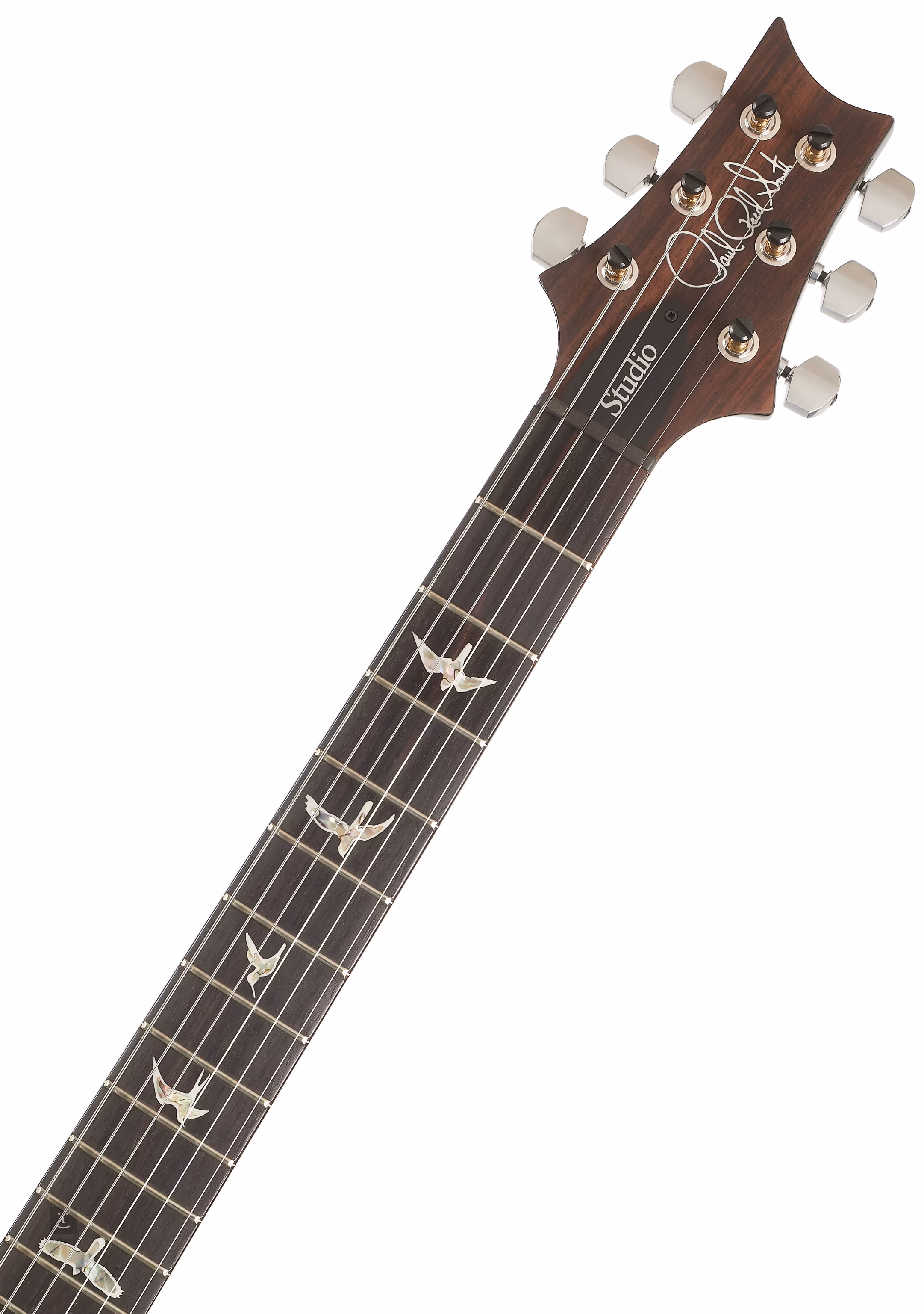 Un corp masiv de mahon cu formă ergonomică, solid, cu tăietura dublă tipică PRS, împodobește topul din arțar. Lipită de gâtul din mahon cu profil Pattern se află o claviatură din lemn de trandafir împodobită cu markeri de poziție din mamă-perlă în formă de siluete de păsări.
