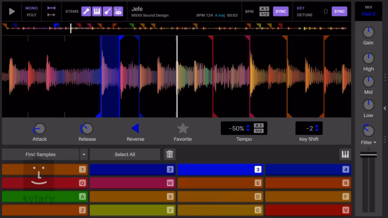 La bază se află Sample Deck, unde puteți tăia, descompune și edita stem-uri (vocal, bas, melodie și tobe) și folosi instrumentul Find Samples pentru a găsi cele mai bune locuri pentru cue points. Cu ajutorul tehnologiei Pitch 'n Time, puteți schimba tonalitatea, tempo-ul, inversa sunetul sau crea un instrument personalizat din fiecare eșantion, fără a pierde din calitate. În plus, toate eșantioanele se sincronizează automat cu tonalitatea și tempo-ul proiectului dvs.