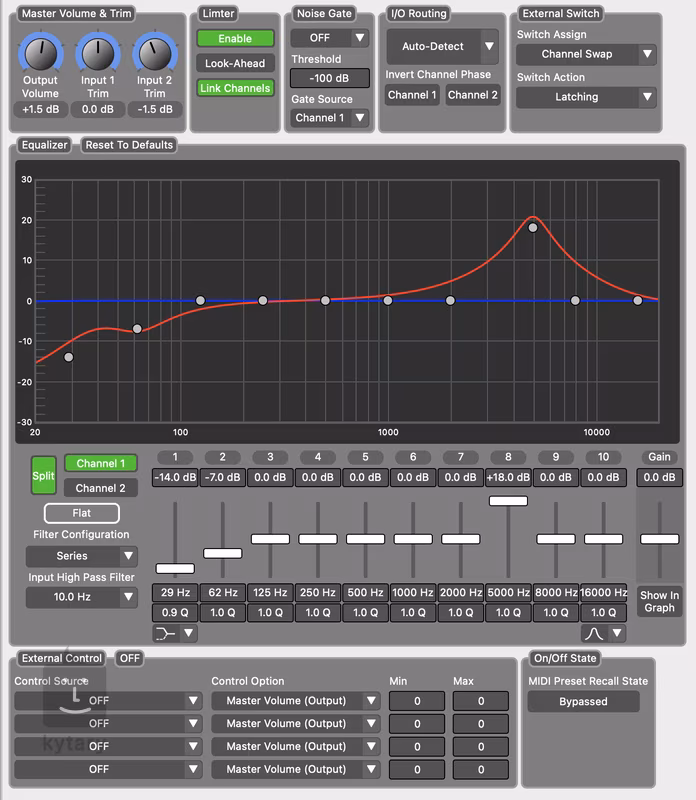 2x Mono (Stereo), MIDI In, Control input, USB