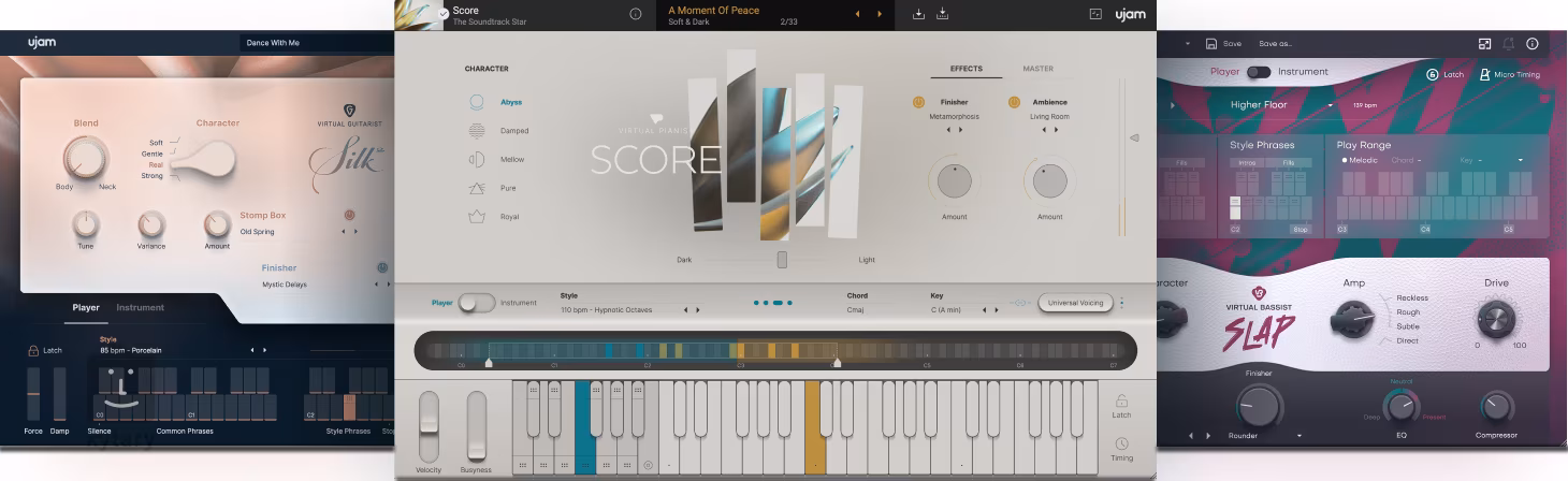 Descoperiți muzicieni virtuali precum Virtual Pianist SCORE pentru părți de pian cinematografice, Virtual Guitarist SILK 2 pentru chitară acustică cu sunet profesional și Virtual Bassist SLAP pentru stiluri funky dinamice. Adaugă energie melodiilor tale cu Virtual Drummer LEGEND pentru sunete rock clasice și Virtual Drummer BRUTE pentru ritmuri grele.