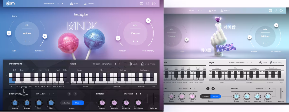 Pentru crearea de ritmuri moderne, utilizați Beatmaker KANDY pentru ritmuri pop lucioase și Beatmaker IDOL pentru stiluri energice K-Pop și EDM. Aduceți la viață sunetele legendare ale anilor '90 cu Usynth TURBO-XT pentru sintetizatoare energice și Usynth PIXEL pentru sunete inspirate de console.