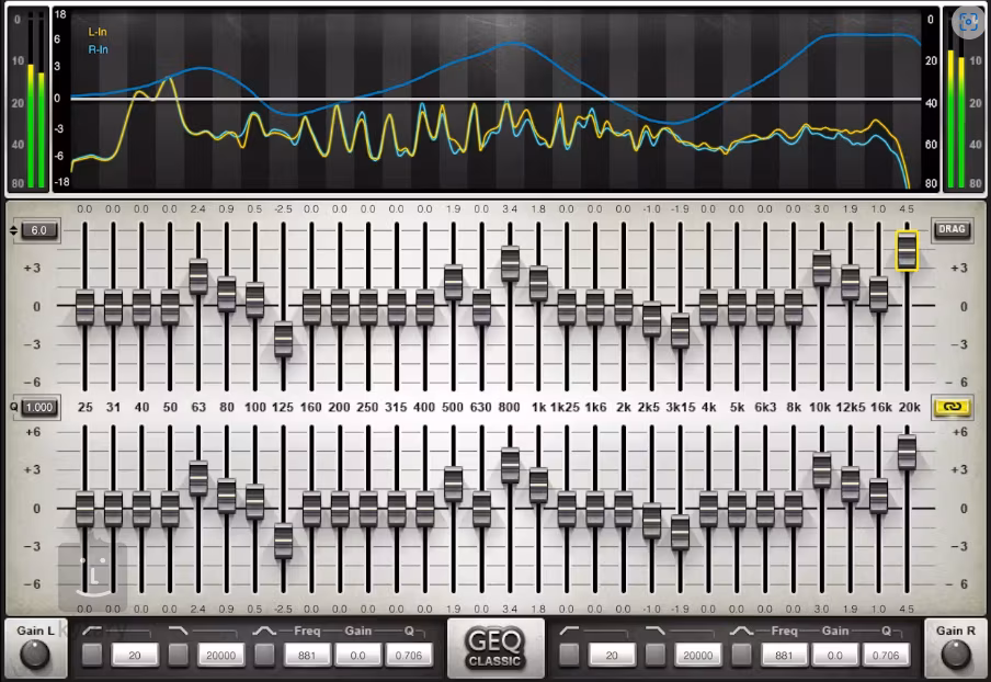 GEQ Graphic Equalizer de la Waves este un egalizator grafic cu 30 de benzi care oferă două moduri de filtrare - clasic și modern. Acest plugin oferă, de asemenea, filtre trece-înalt și trece-jos cu frecvență variabilă, un EQ de clopot complet parametric și un analizor în timp real cu două intrări. GEQ este proiectat să funcționeze cu latență zero, ideal pentru ingineria de sunet live și munca de studio.